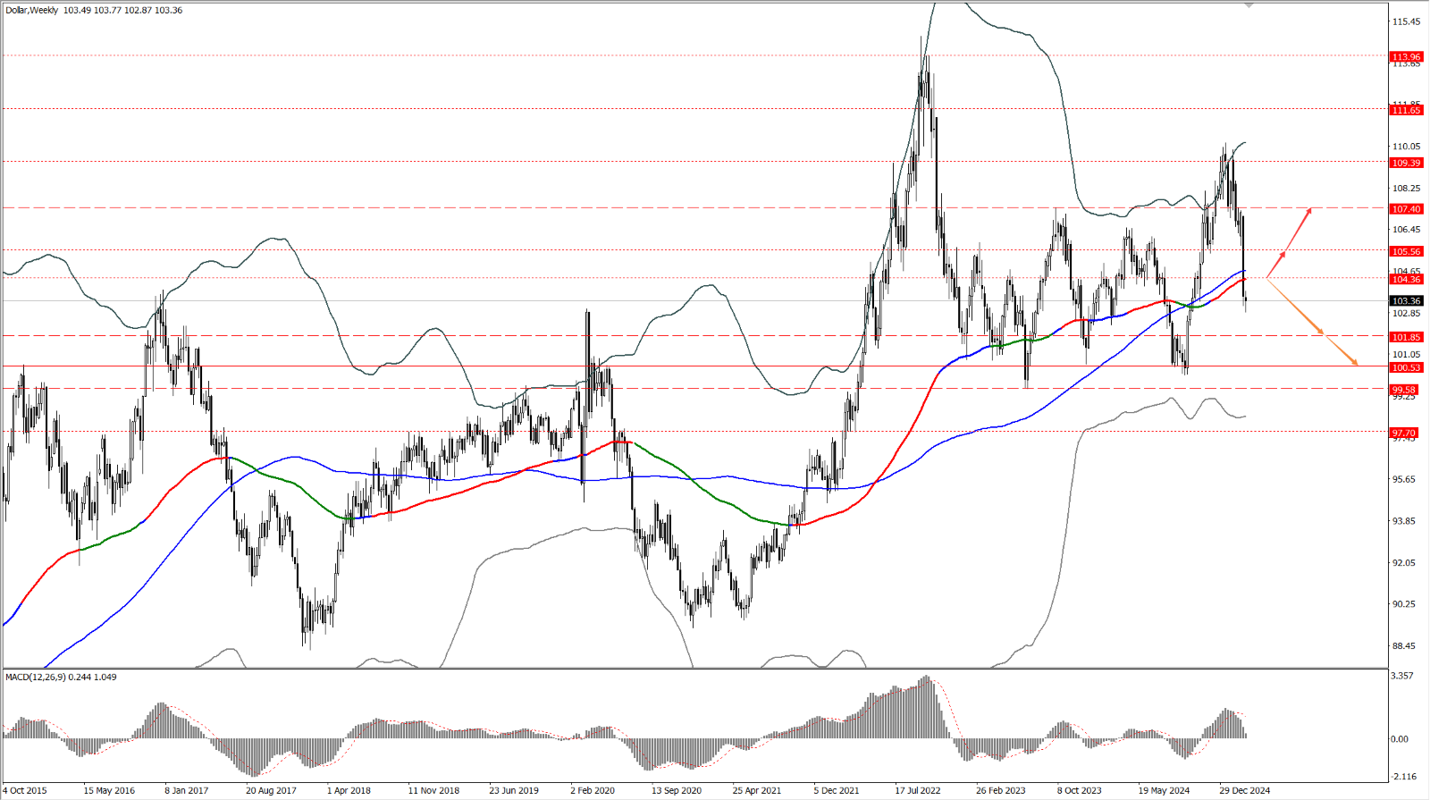 달러 지수가 104.36선을 돌파하고 안정적으로 반등할 경우 반등 강도를 평가하며 105.56과 107.40선에서의 저항을 주목해야 합니다. 반등해 상승세를 회복한다면 105.56107.50선에서의 저항 여부가 중요한 관전 포인트가 될 것입니다.