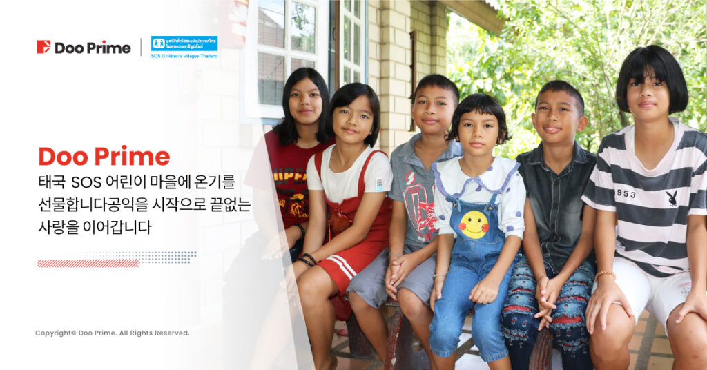 Doo Prime은 매년 크리스마스를 앞두고 태국 남부 도시인 Hui Fu의 SOS 어린이 마을에 집 수리 비용으로 35만 바트(약 1만 2300달러)를 기부하였습니다. Doo Prime은 SOS 어린이마을 아이들 모두가 따뜻하고 편안한 새 보금자리에서 즐거운 크리스마스를 보내길 바랍니다.