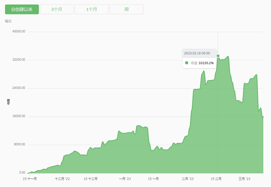 “小牛0001号”交易信号源创建于 2022 年 10 月 4 日,自创建以来,其收益率已经实现了大幅增长,整体回报率在一众信号源中可谓位列前茅。2023 年 2 月 16 日,其回报率达到了33,235.2% 的顶点,即回报率暴涨逾 330 倍有余。