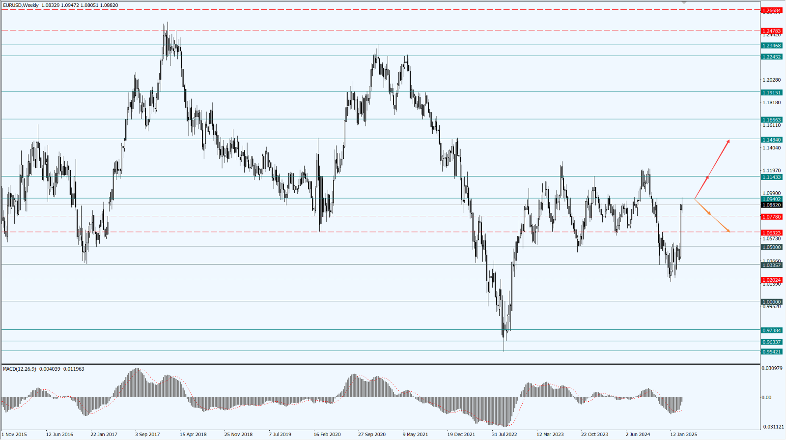 • 如果欧元兑美元企稳回弹并站稳于 1.0940 一线,则将打开进一步的上行空间,届时依次关注 1.1143 和 1.1484 两个位置的压制力度。