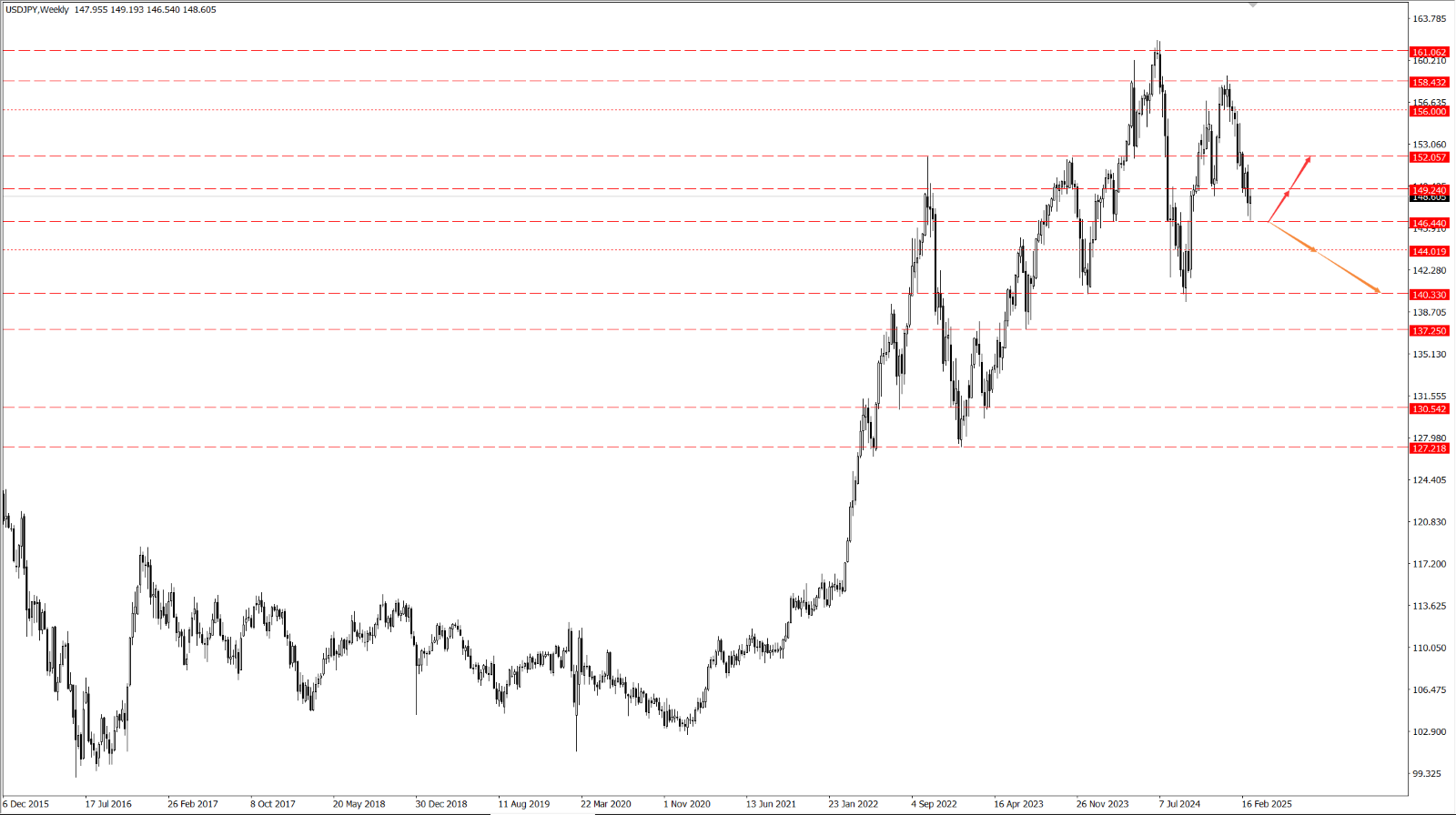 • 如果美元兑日元承压回落并力度跌破 146.44 一线,则将打开进一步下行空间,届时依次关注 144.01 和 140.33 两个位置的支撑力度。