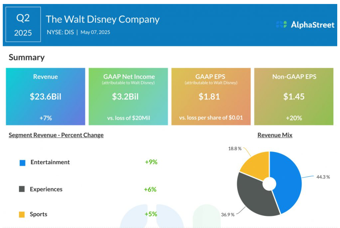 具体来看,迪士尼第二财季营收为 236.2 亿美元,高于预期的 230.5 亿美元,同比增长 7%;调整后每股收益为 1.45 美元,也高于预期的 1.20 美元,同比大幅增长 20%。