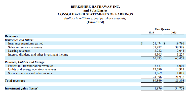 伯克希尔的 2024 年第一季度财报显示: