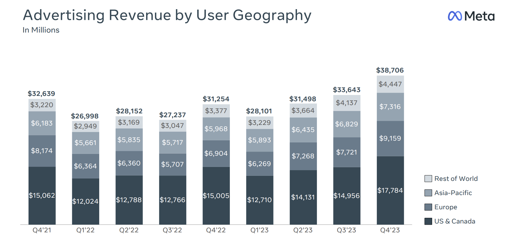 展望截至 3 月的 2024 年第一季度,Meta 预计营收 345 亿- 370 亿美元,高于分析师预期 336.4 亿美元。