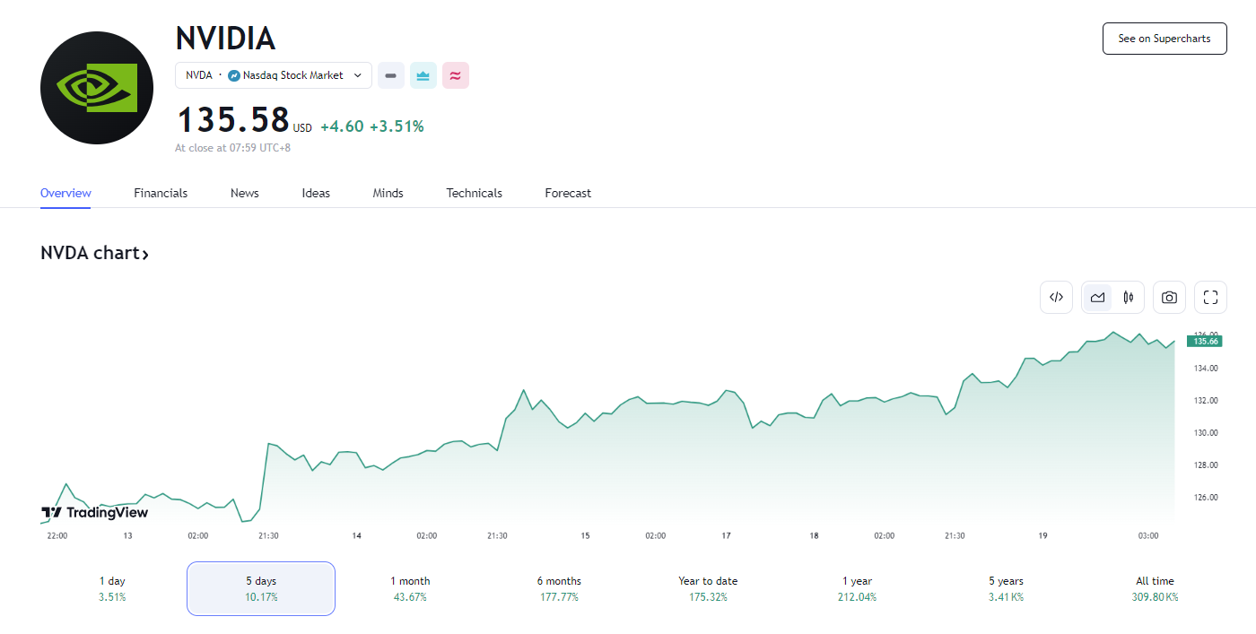 美股收盘,英伟达股价上涨 3.51%,报 135.5 8美元,再创历史新高,总市值达 3.335 万亿美元,一举超过了微软和苹果,成为全球最具价值的上市公司。目前,微软市值约 3.32 万亿美元,苹果市值 3.28 万亿美元。