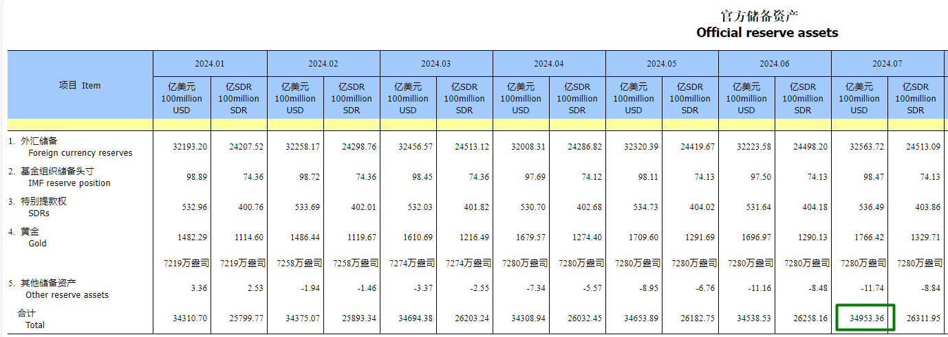 中国国家外汇管理局表示,2024 年 7 月,受主要经济体宏观经济数据、货币政策及预期等因素影响,美元指数下跌,全球金融资产价格总体上涨,经济运行总体平稳、稳中有进,延续回升向好态势,有利于资产储备规模继续保持基本稳定。