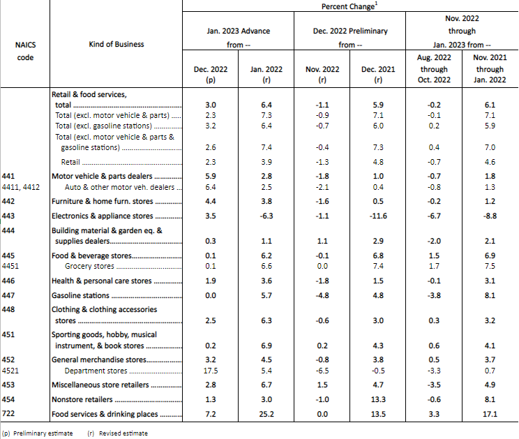 北京时间 2 月 15 日,美国商务部普查局发布 “恐怖数据” ,美国 1 月零售销售数据环比增加 3%,远超市场预期的 1.8%,前值为 -1.1%,为 2021 年 3 月以来最大增幅。