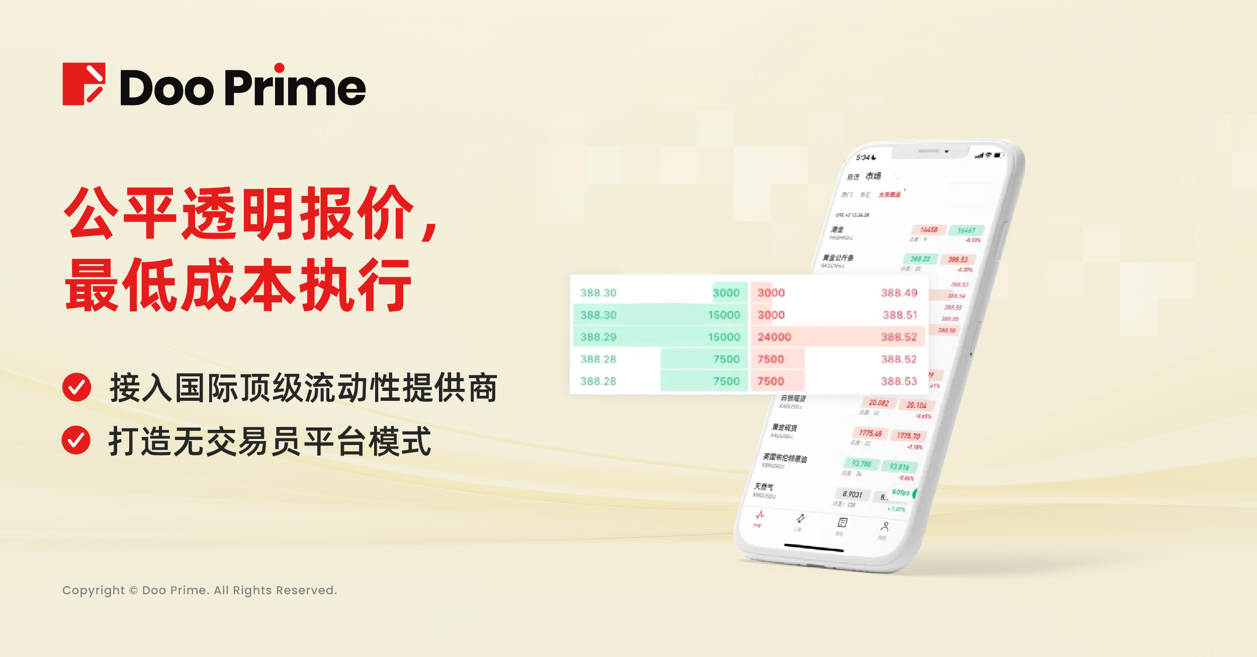 Doo Prime 与全球 20 多家国际顶级交易银行、流动性提供商和 ECN 合作伙伴连接,可提供稳定多元化的产品报价。同时, Doo Prime 以无交易员平台 (NDD)模式,构建公平透明的报价模型,让投资者以最低的成本执行交易。