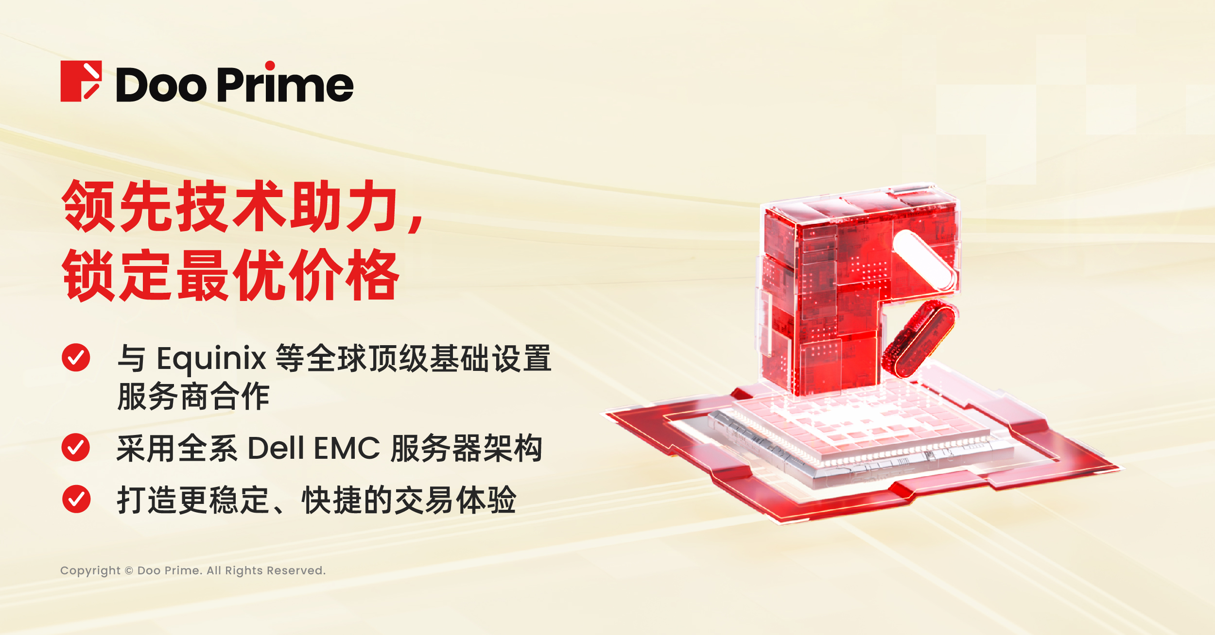 同时,Doo Prime 与全球领先的数据运营商 Equinix 合作,99.5% 的交易订单在 50 毫秒被执行。平台采用全系 Dell EMC 服务器架构,配备 Inter Xeon® E7 及 AMD EPYC® 7 系中央处理器,为处理即时报价数据与客户订单提供强大的性能支持。