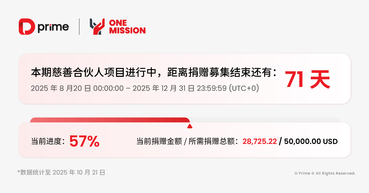 自 2025 年 8 月 20 日”慈善合伙人计划”启动至今,D Prime 携手广大客户用善意共同书写的公益答卷,在这个金秋时节迎来了温暖的半程里程碑:云县特殊教育学校运动场建设公益项目捐赠募集进度已超过 50%,当前捐赠金额已达 28,725.22 USD(数据截止时间 2025/10/21)。