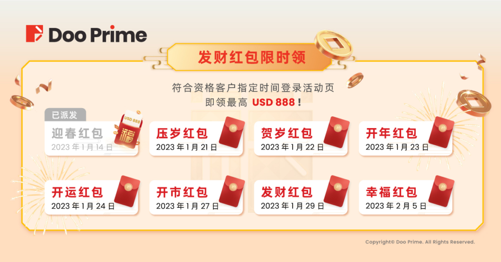 春节期间,除了新年全球大抽奖外,Doo Prime 也将重磅推出 8 次发财红包,首次发财红包已经于 1 月 14 日派发完毕,恭喜获得现金红包的客户。如果您错过了首批发财红包,那么千万不要错过接下来的 7 次限时发财红包。其中 4 次将会于 2023 年 1 月 21 日 00 : 00 (UTC + 8) 至 2023 年 1 月 24 日 23:59 (UTC + 8)派发,一连四天、每日一次的限量红包将会是您新年期间不可缺席的重磅福利,还有另外 3 次的发财红包也会在新年期间陆续派发。愿我们的客户在这个春节收获好运,在新一年顺利开启新征程。