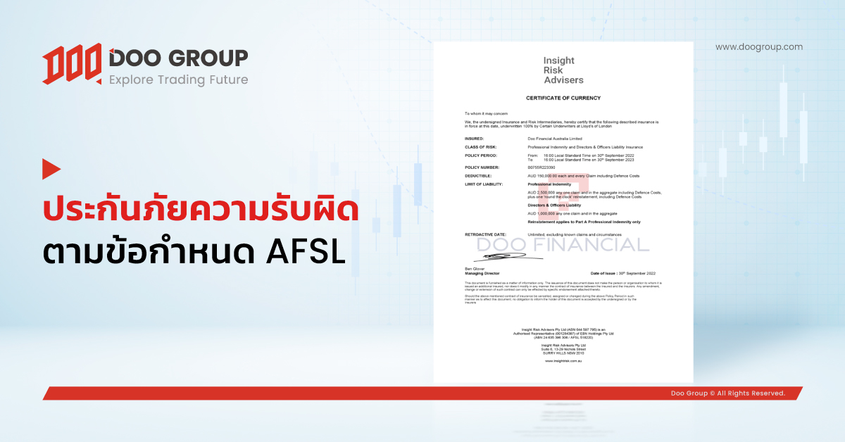 เมื่อไม่นานมานี้ Doo Financial Australia Limited บริษัทพี่ของ Doo Prime ซื้อประกันภัยความรับผิดทางวิชาชีพ (Professional Liability Indemnity Insurance (PII)) จาก Lloyd’s of London ที่เป็นผู้รับประกันภัย เป็นการปฏิบัติตามข้อกำหนดของผู้ที่ถือใบอนุญาตจากองค์กรให้บริการด้านการเงินแห่งออสเตรเลีย (Australian Financial Services License: AFSL)