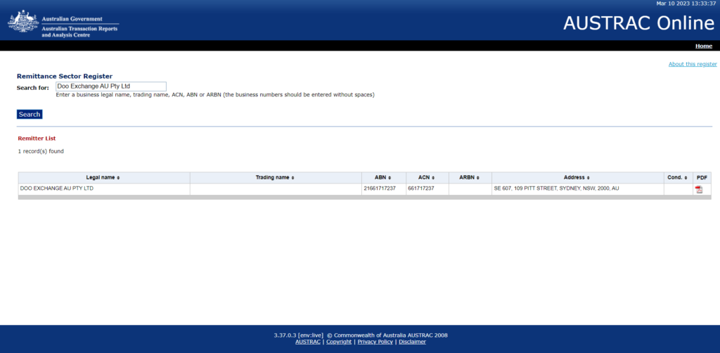 สำหรับข้อมูลเพิ่มเติม โปรดค้นหา “Doo Exchange AU Pty Ltd” ในเว็บไซต์อย่างเป็นทางการของหน่วยงาน AUSTRAC https://online.austrac.gov.au/ao/public/rsregister.seam