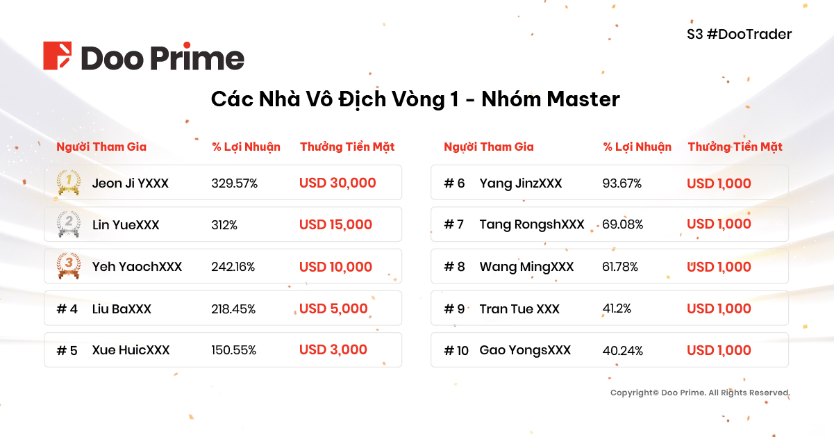 Chúc Mừng Các Nhà Vô Địch Vòng 1 – Cúp Giao Dịch Toàn Cầu #DooTrader Mùa 3