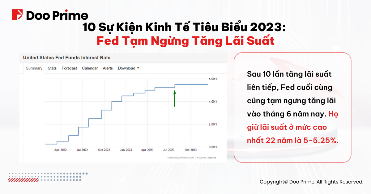 Các đợt cắt giảm nhân sự của các công ty công nghệ, sự sụp đổi của các ngân hàng Mỹ và mức nợ tăng cao của chính phủ Mỹ đã làm gián đoạn quyết định tăng lãi suất kéo dài của Fed. Sau 10 lần tăng lãi suất liên tiếp, Fed cuối cùng cũng “nhấn nút” tạm ngưng vào tháng 6 năm nay, duy trì mức lãi suất quỹ liên bang cao nhất trong vòng 22 năm là từ 5% đến 5,25%. Quyết định dừng tăng lãi suất của Fed báo hiệu một lập trường diều hâu mạnh mẽ, với tuyên bố về hai đợt tăng lãi suất nữa trong năm 2023. Thị trường gọi động thái này là “sự tạm dừng diều hâu”.