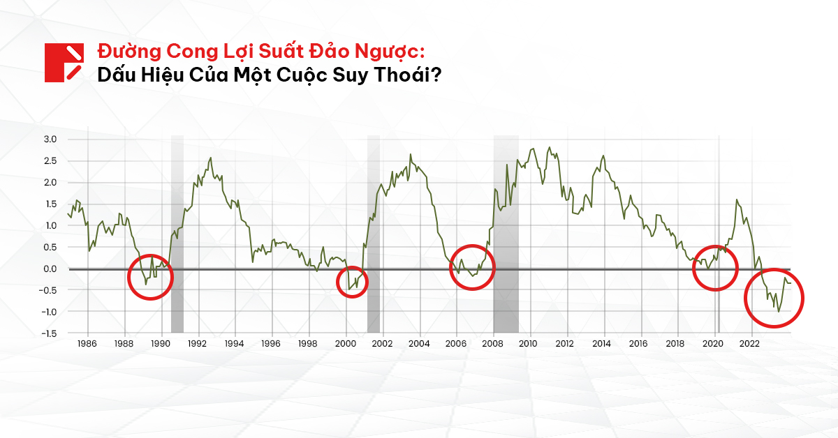Thêm đó, một chỉ báo quan trọng khác là đường cong lợi suất đảo ngược. Mỗi một đợt suy thoái trong lịch sử đều bắt đầu bằng sự đảo ngược của đường cong lợi suất ngắn hạn và dài hạn.