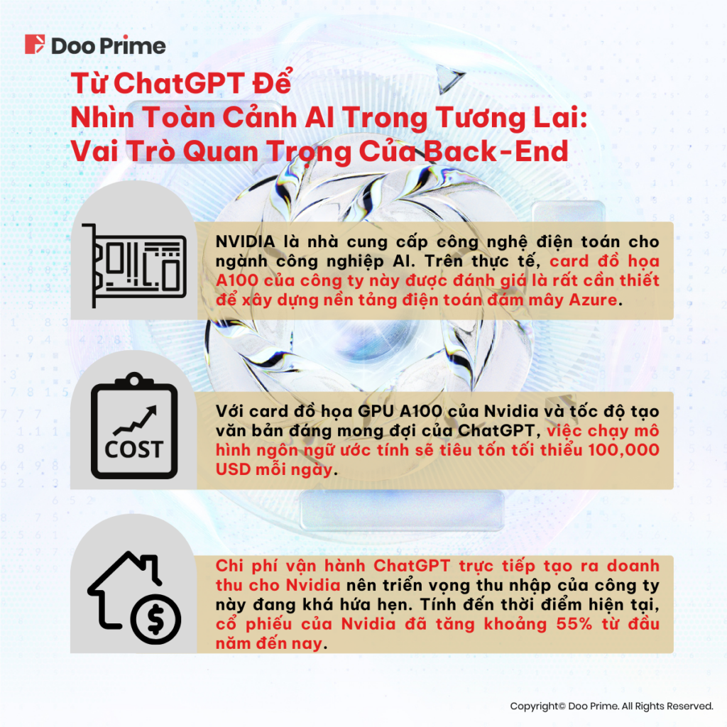 NVIDIA, vốn được biết đến rộng khắp với mảng đồ họa chơi game cao cấp, sở hữu lợi thế đặc biệt trong ngành AI. Hãy lấy OpenAI làm ví dụ: OpenAI hoạt động dựa trên nền tảng điện toán đám mây Azure của Microsoft, chạy trên card đồ họa GPU A100 của NVIDIA. GPU A100 có thể xử lý 3 tỷ tham số trong vòng 6 mili giây, chính vì thế đóng vai trò thiết yếu trong công nghệ AI nói chung và ChatGPT nói riêng, khi sở hữu khả năng tạo ra 175 tỷ tham số nhằm cấu thành một từ.