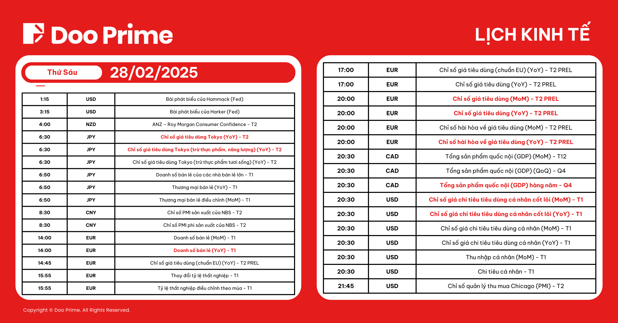 Doo Prime xin thông tin đến bạn những sự kiện kinh tế nổi bật từ 24/02 đến 28/02/2025.